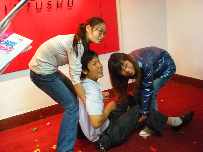 四人合力吹氣球、破氣球,玩的不亦樂乎!