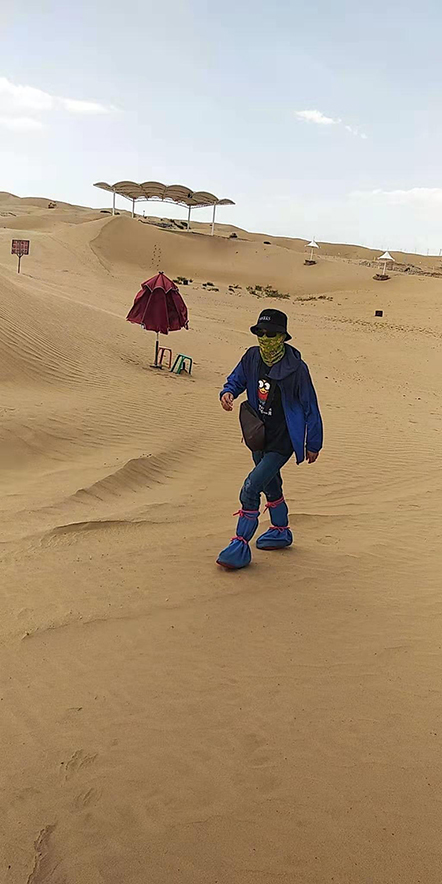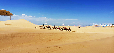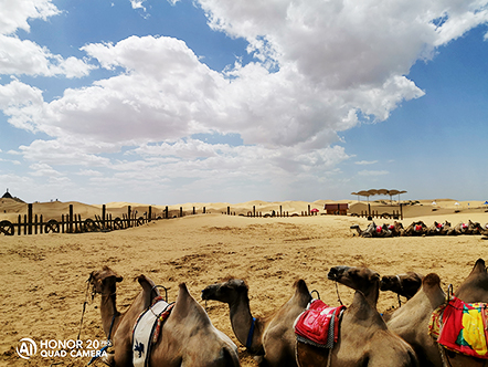 黃沙漫漫,一望無際的金黃,映入眼簾,腳踏黃沙,頭頂藍天,這是一種前所未有的放空,心情異常平靜,無一絲波瀾。騎上駱駝,它們自動排成一排,代領我們領略這個神秘的地區(qū)。
